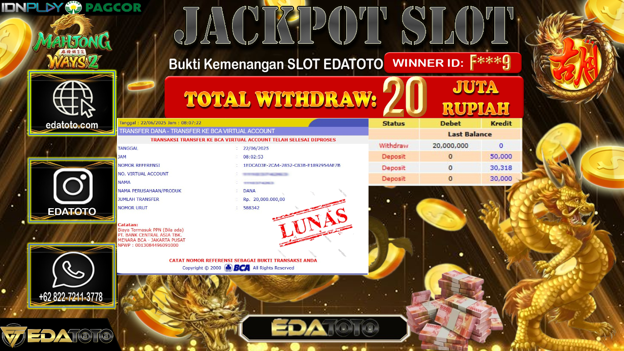 Selamat Kepada Pemilik user ID : F***9 Hari/Tanggal : Minggu/ 22, Juni 2025 Jackpot : Rp. 20.000.000 JT Permainan : Mahjong . . .