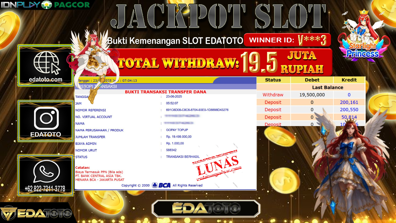 Selamat Kepada Pemilik user ID : V***3 Hari/Tanggal : Senin/ 23, Juni 2025 Jackpot : Rp. 19.500.000 JT Permainan : Starlight . . .