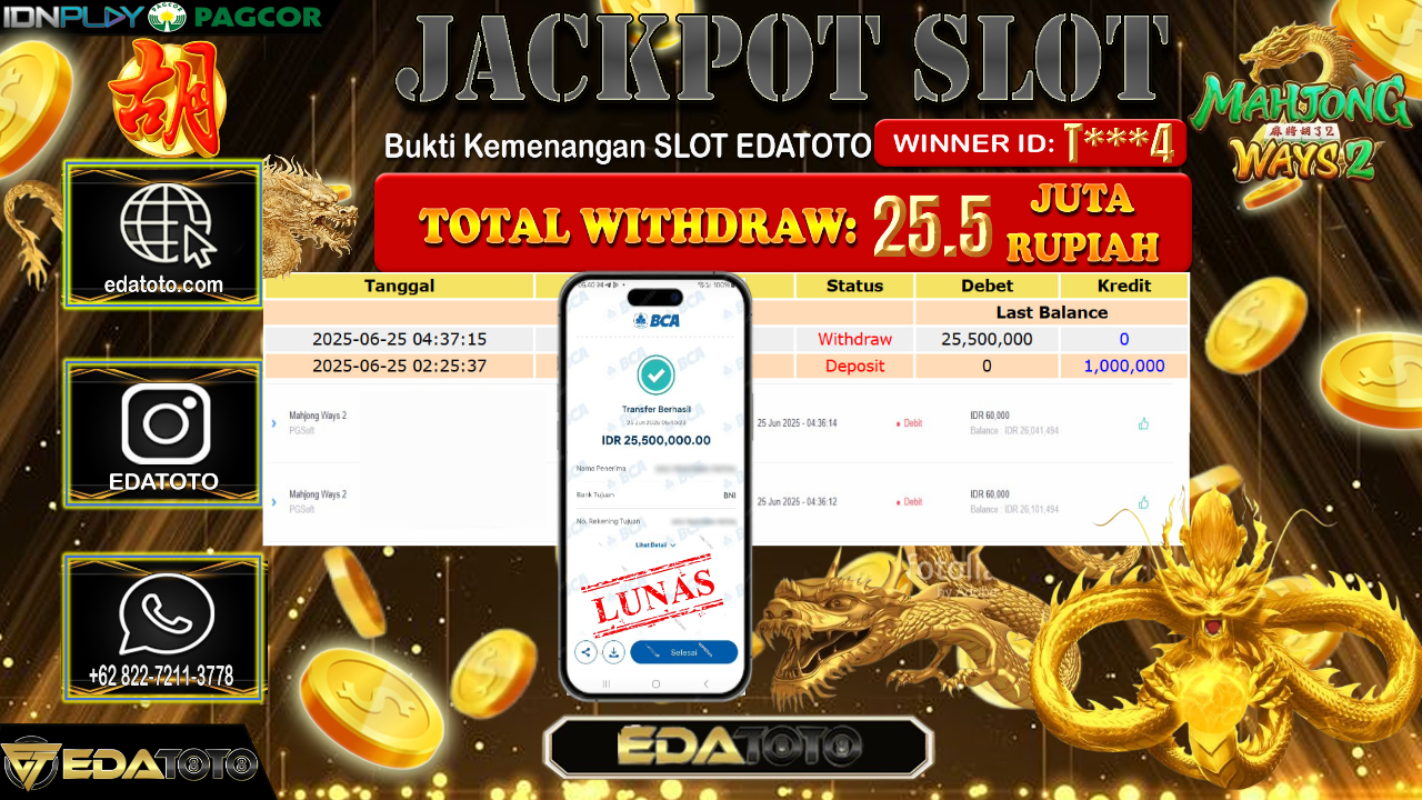 Selamat Kepada Pemilik user ID : T***4 Hari/Tanggal : Rabu/ 25, Juni 2025 Jackpot : Rp. 25.500.000 JT Permainan : Mahjong . . .