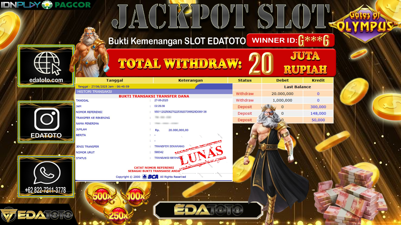 Selamat Kepada Pemilik user ID : G***6 Hari/Tanggal : Jum’at/ 27, Juni 2025 Jackpot : Rp. 20.000.000 JT Permainan : Gates . . .
