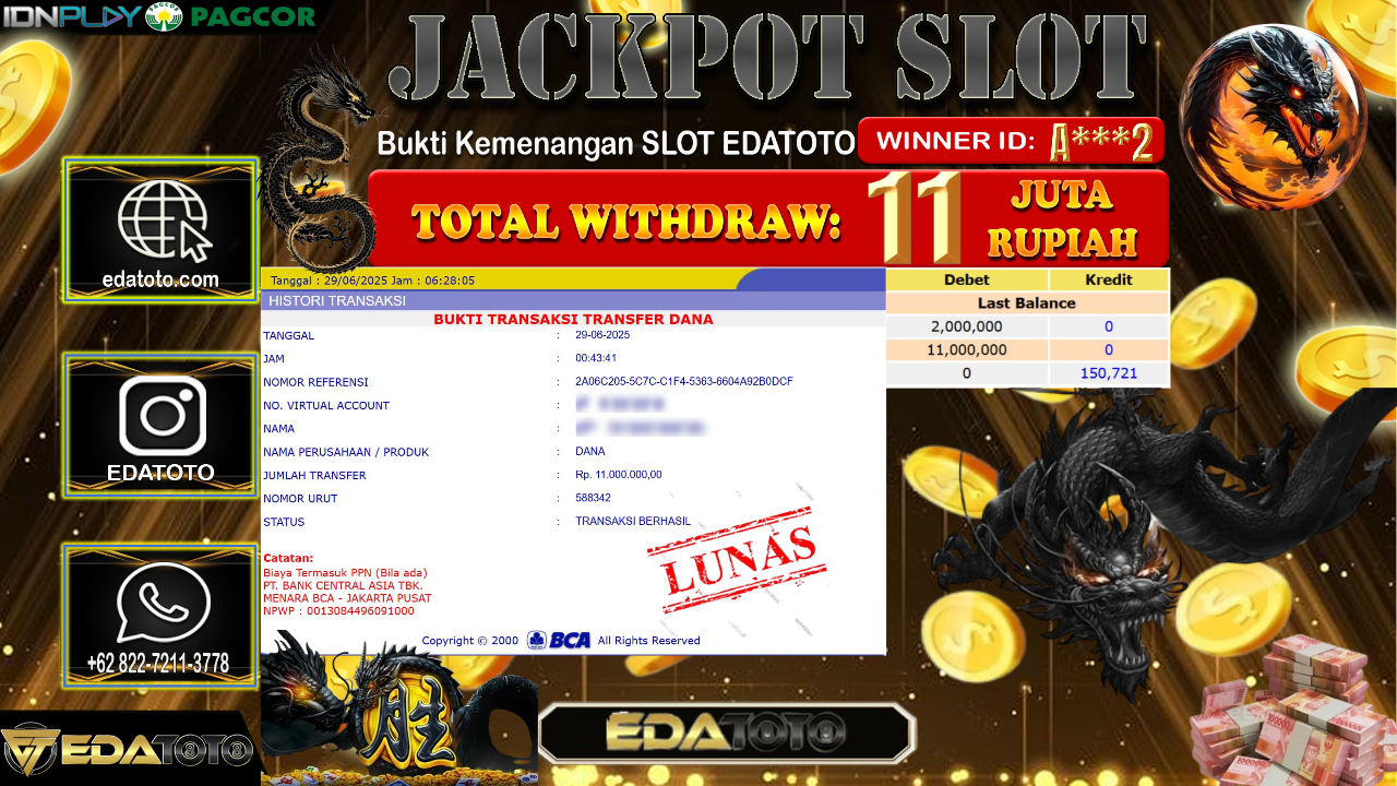 Selamat Kepada Pemilik user ID : A***2 Hari/Tanggal : Minggu/ 29, Juni 2025 Jackpot : Rp. 11.000.000 JT Permainan : mahjong . . .
