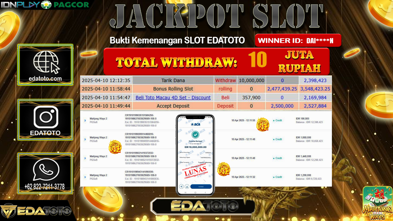 Selamat Kepada Pemilik user ID : DAI****N Hari/Tanggal : Jumat/ 11 , April 2025 Jackpot : Rp. 10.000.000 JT Permainan . . .