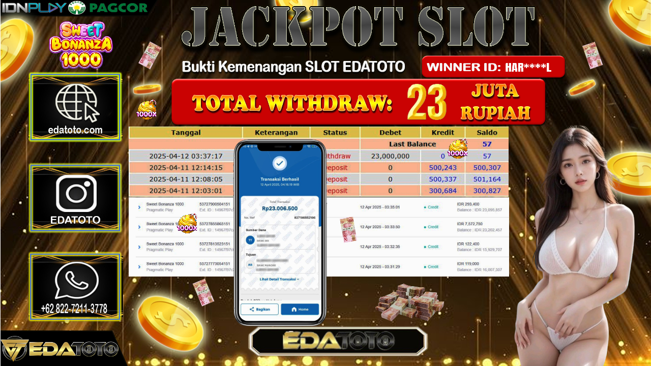 Selamat Kepada Pemilik user ID : HAR****L Hari/Tanggal : Minggu/ 13 , April 2025 Jackpot : Rp. 23.000.000 JT Permainan . . .