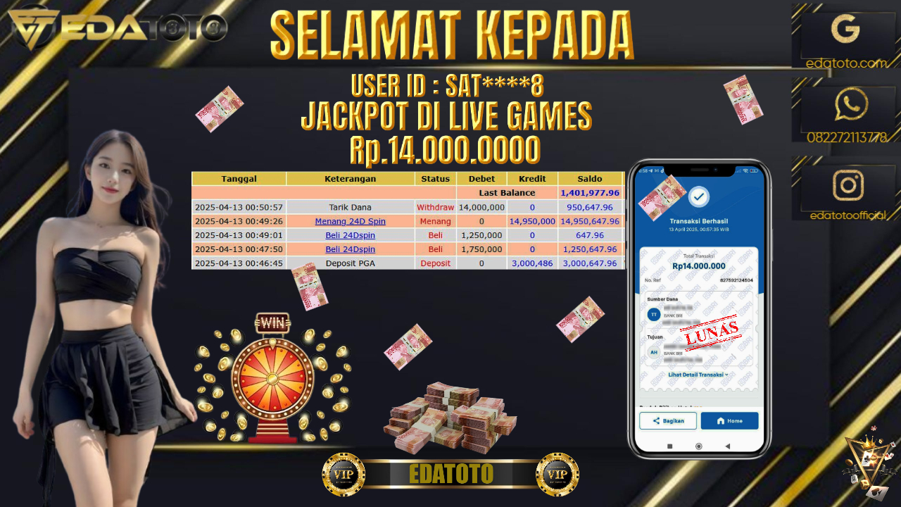 Selamat Kepada Pemilik user ID : SAT****8 Hari/Tanggal : Senin / 13 , April 2025 Jackpot : Rp. 14.000.000 . . .