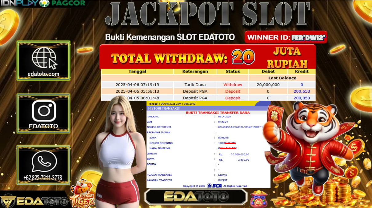 Selamat Kepada Pemilik user ID : fer*dwi2* Hari/Tanggal : Sabtu / 06 , April 2025 Jackpot : Rp. 20.000.000 JT . . .