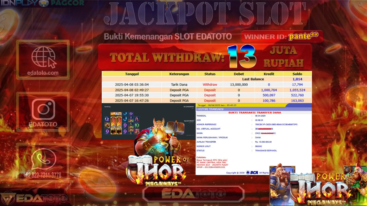 Selamat Kepada Pemilik user ID : pante** Hari/Tanggal : Sabtu / 08 , April 2025 Jackpot : Rp. 13.000.000 JT . . .