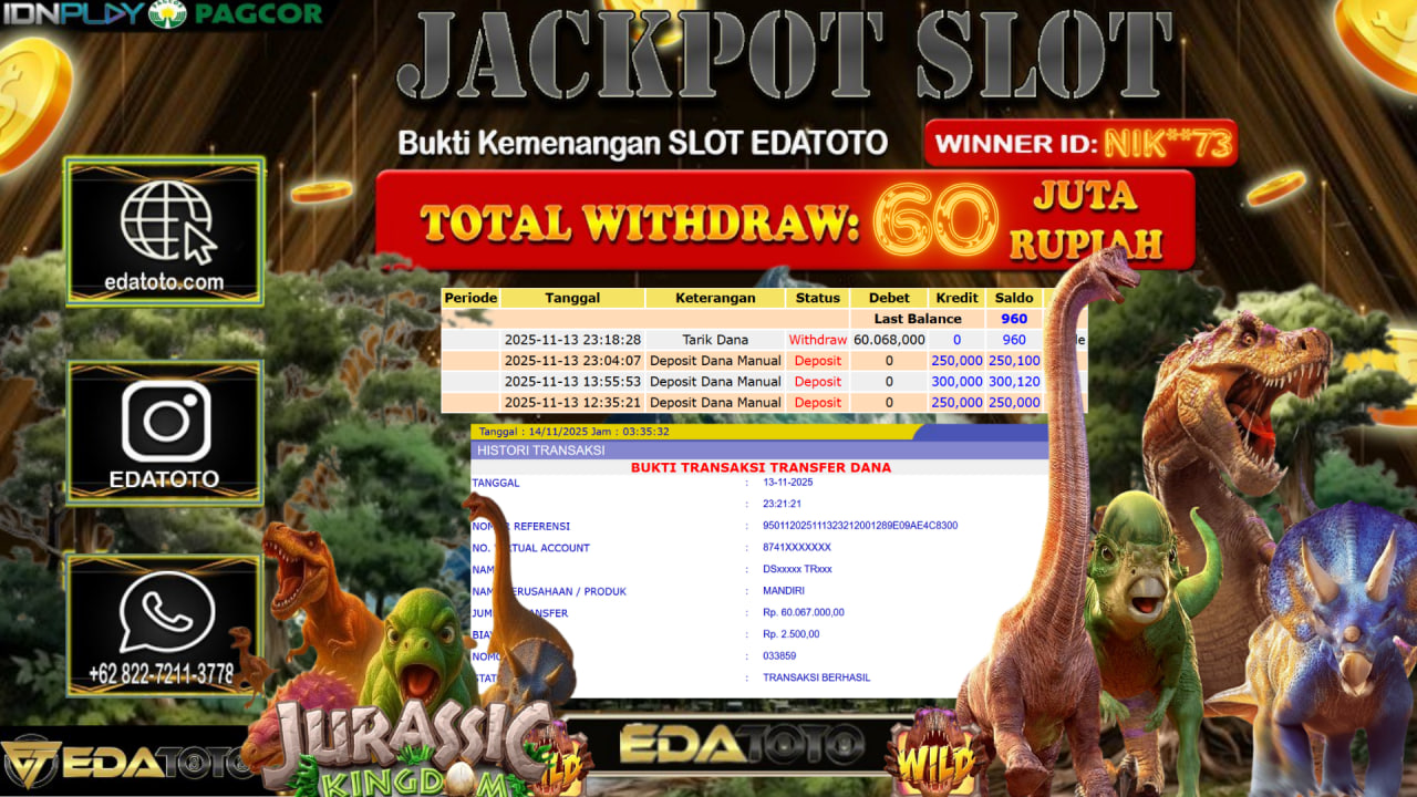 Selamat Kepada Pemilik user ID : Nik**73 Hari/Tanggal : Rabu / 12, November 2025 Jackpot : Rp. 63,125,400 JT Withdraw . . .