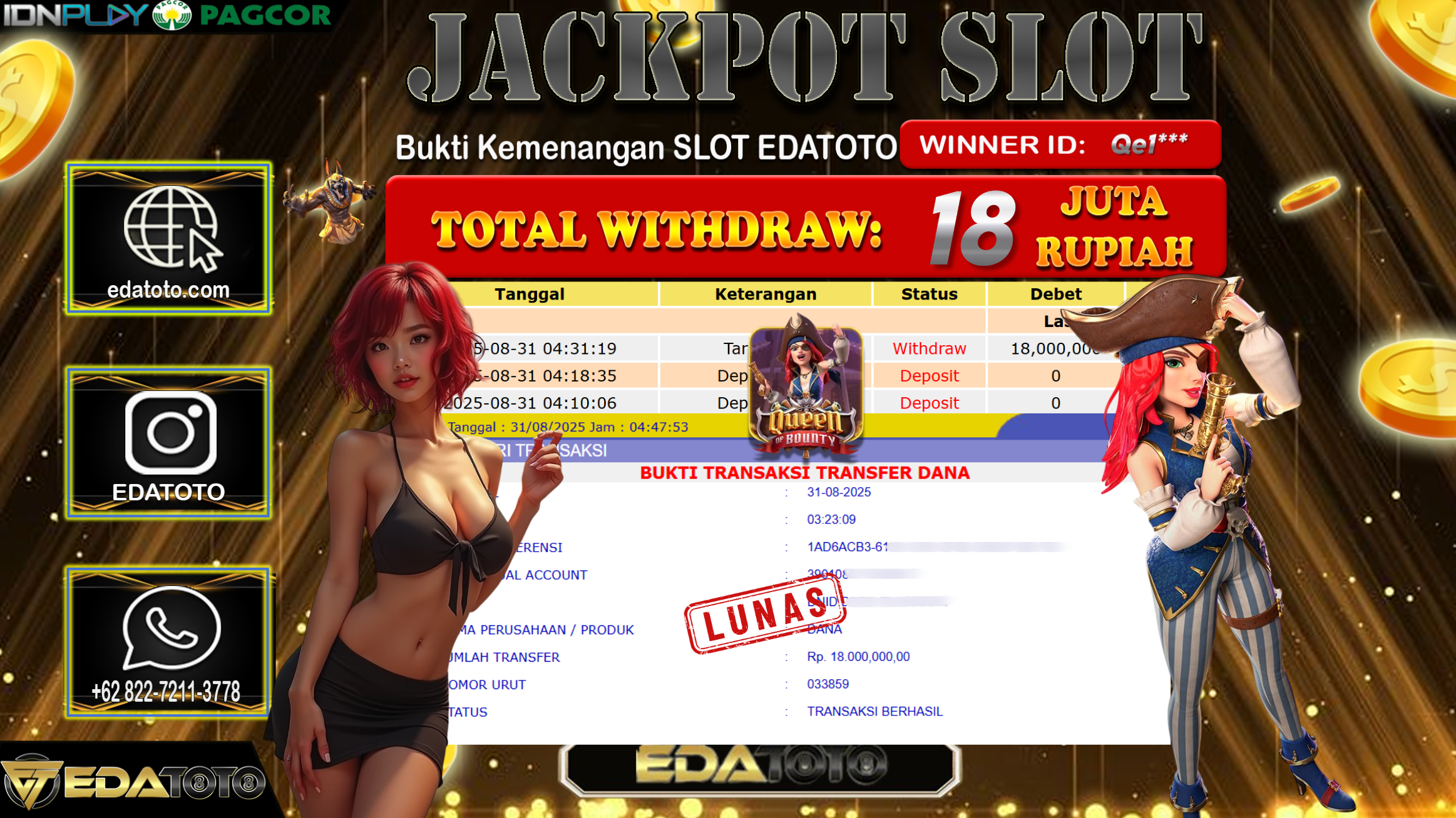 Selamat Kepada Pemilik user ID : G2*** Hari/Tanggal : Minggu/ 31, Agustus 2025 Jackpot : Rp. 18.000.000 JT Permainan : . . .