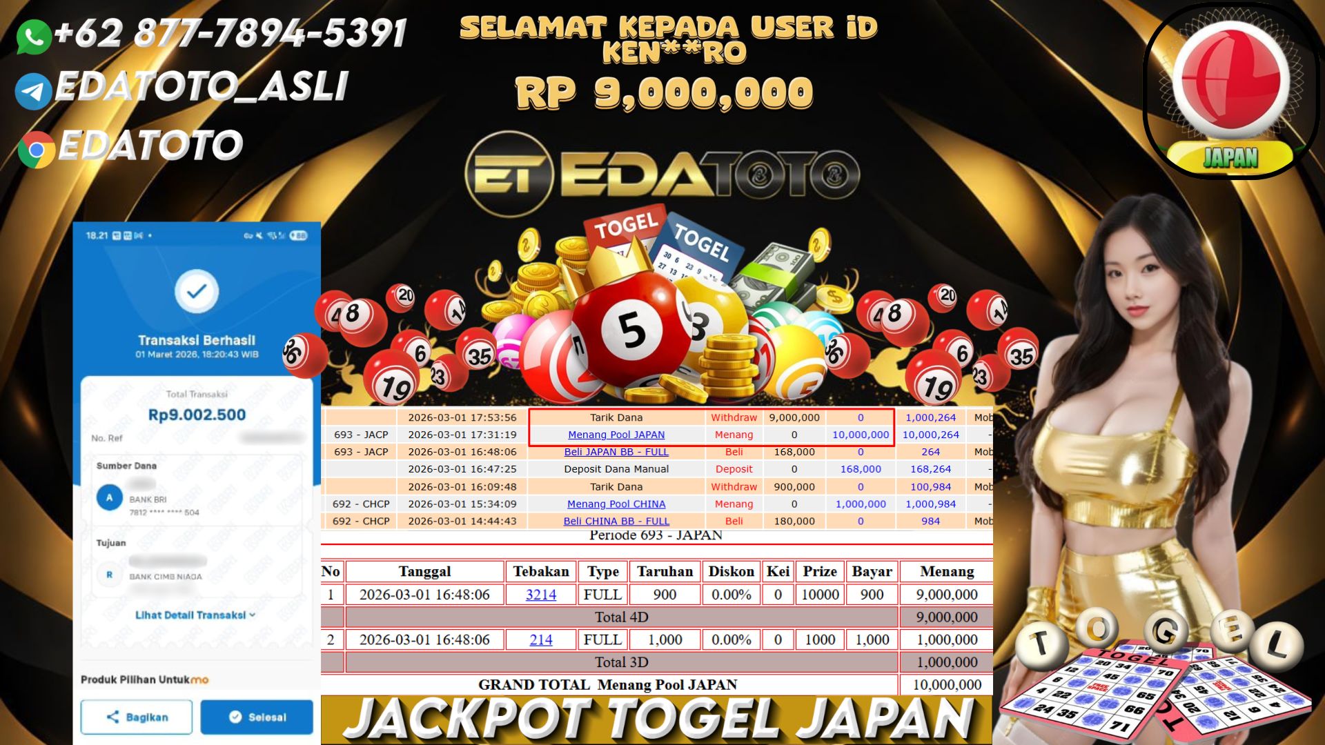 Selamat Kepada Pemilik user ID : KEN**RO Hari/Tanggal : MINGGU / 01 MARET 2026 Jackpot : Rp, 10,000,000 JT Withdraw . . .