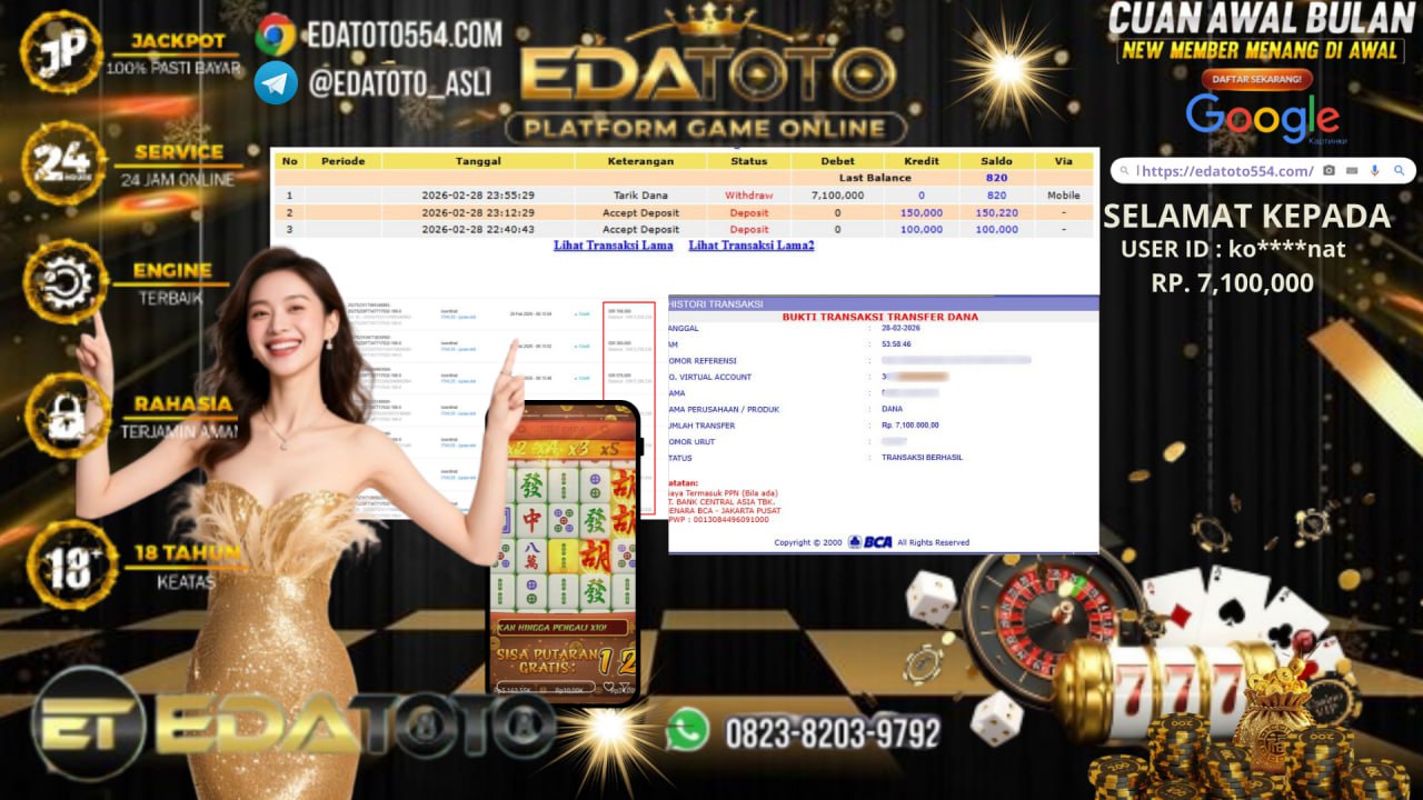 Selamat Kepada Pemilik user ID : kor****nat Hari/Tanggal : Sabtu / 28 Februari 2026 Jackpot : Rp, 7,000,000 JT Withdraw . . .