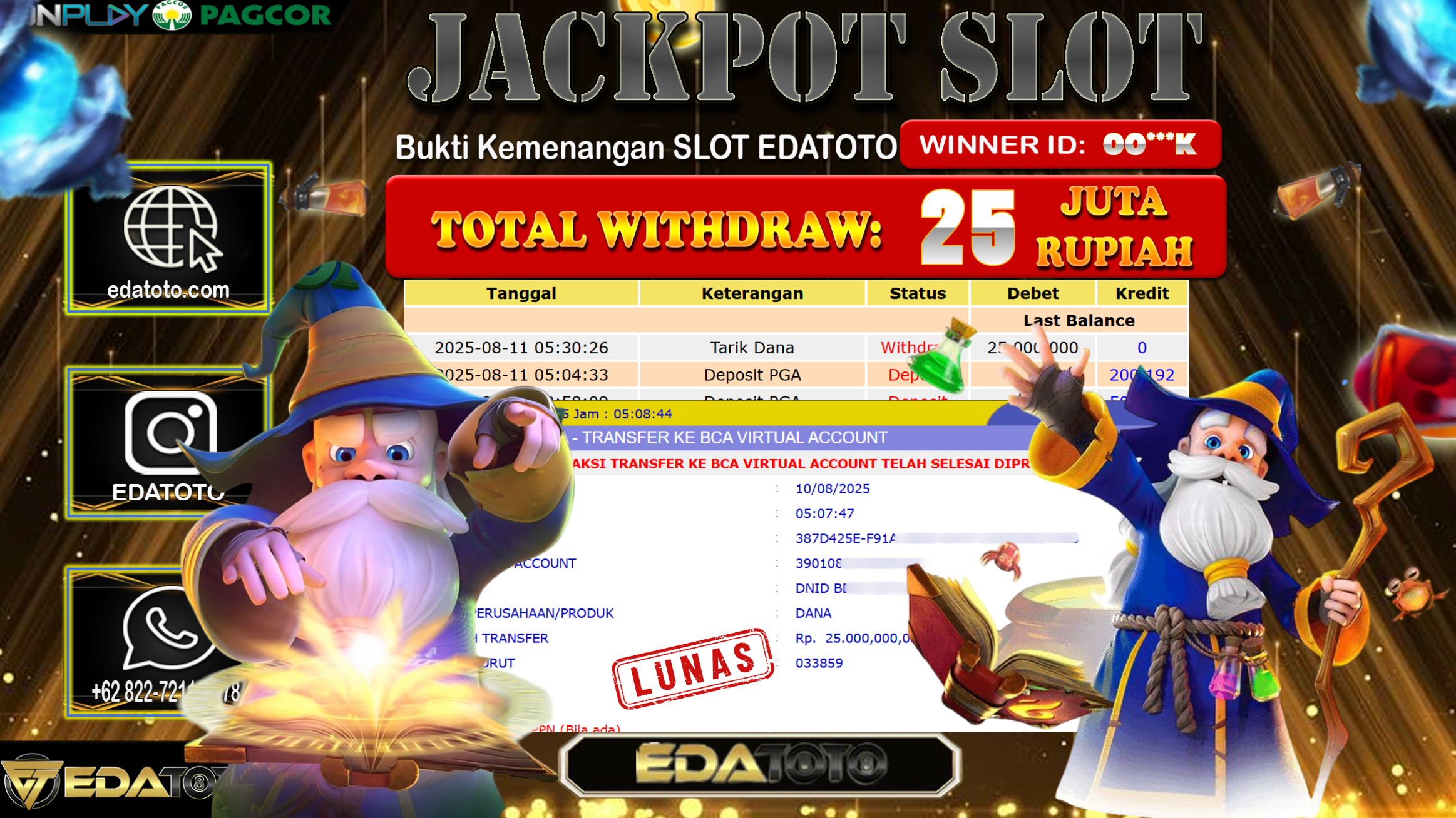 Selamat Kepada Pemilik user ID : 00***K Hari/Tanggal : Senin/ 11, Agustus 2025 Jackpot : Rp. 25.000.000 JT Permainan : . . .