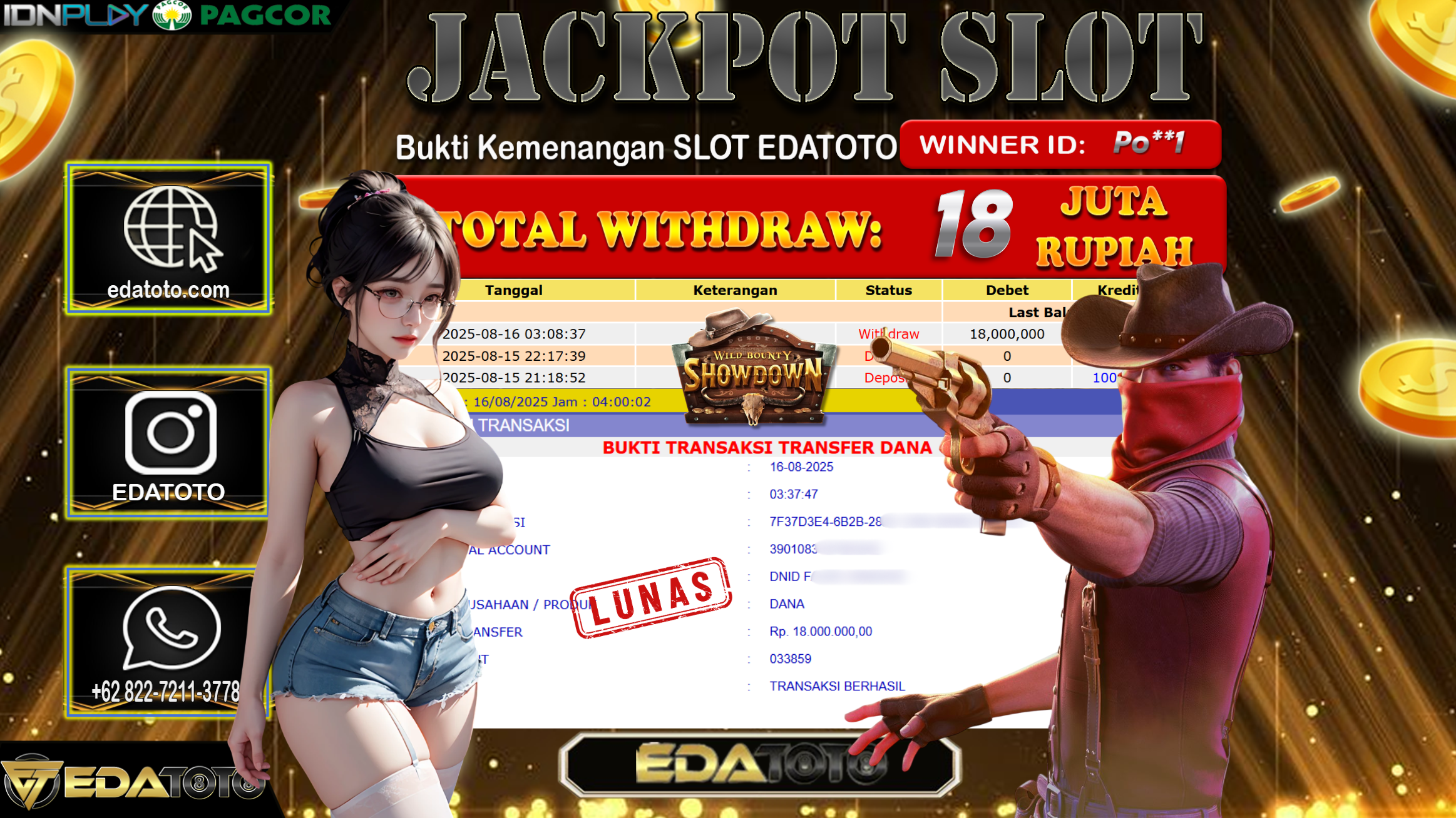 Selamat Kepada Pemilik user ID : Po**1 Hari/Tanggal : Minggu/ 17, Agustus 2025 Jackpot : Rp. 18.000.000 JT Permainan : . . .